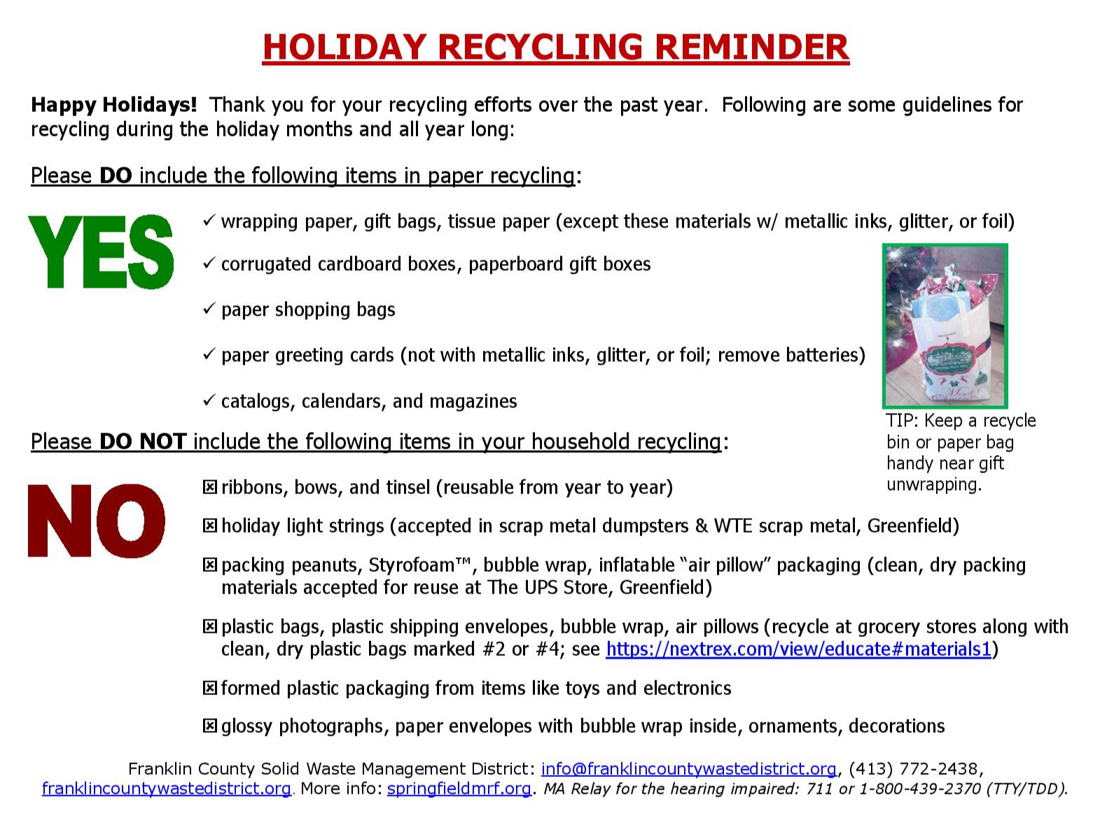 To contact Franklin County Solid Waste Management District: (413) 772-2438, info@franklincountywastedistrict.org; or visit franklincountywastedistrict.org. MA Relay for the hearing impaired: 711 or 1-800-439-2370 (TTY/TDD).