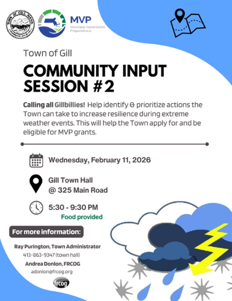 The Town will be hosting it's second workshop to collect information from municipal officials and residents to develop our MVP plan. The second meeting will develop an action plan to address the identified climate change vulnerabilities of Gill’s infrastructure, society, and environment.